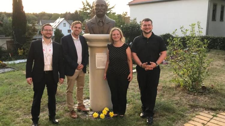 Großpösna, 24. August 2019. - Die Vorsitzende des FDP-Kreisverbandes Leipziger Land-Muldental, Anja Jonas, sowie weitere Vorstandsmitglieder und Besucher versammelten sich in Störmthal, einem Ortsteil von Großpösna, um Friedrich Naumann an dessen 100. Todestag zu gedenken. Naumann, geboren 1860 in Störmthal und gestorben 1919 in Tavermünde, war evangelischer Theologe, liberaler Politiker zur Zeit des Deutschen Kaiserreichs, Mitbegründer des Deutschen Werkbunds und der Deutschen Demokratischen Partei und ist Namensgeber der FDP-nahen Friedrich-Naumann-Stiftung für die Freiheit. Es erfolgte eine Blumenniederlegung an der Stele nahe seines Geburtshauses.